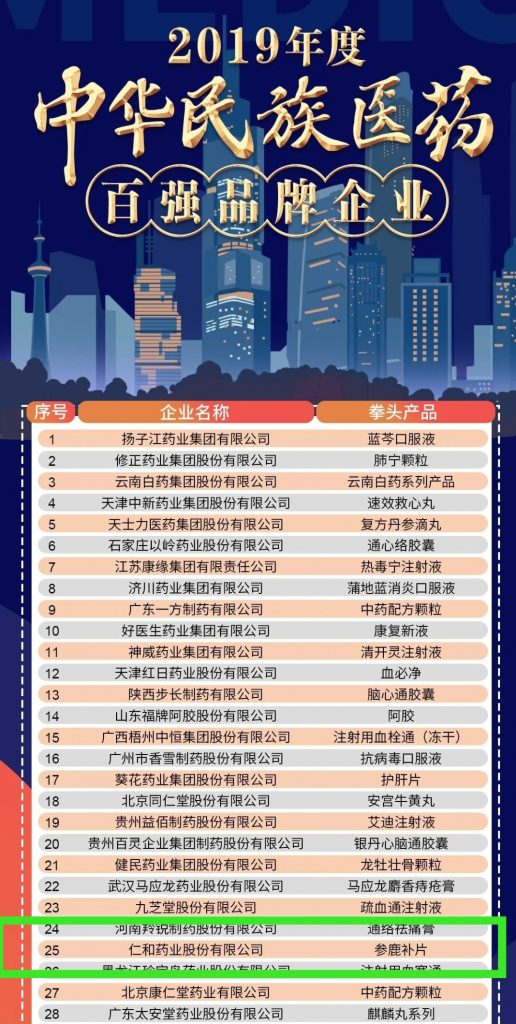 12月16日,中華全國工商聯(lián)醫(yī)藥業(yè)商會公布了2019年度中華民族醫(yī)藥百強(qiáng)品牌企業(yè)榜,仁和藥業(yè)股份有限公司連續(xù)4年入選,位列榜單第25位。自成立以來,仁和始終秉承為人類健康服務(wù)的宗旨,繼承和創(chuàng)新中醫(yī)藥傳統(tǒng)衣缽,打造出“大活絡(luò)丸”、“強(qiáng)力枇杷膠囊”、“參鹿補(bǔ)片”等民族醫(yī)藥產(chǎn)品,為弘揚(yáng)民族醫(yī)藥事業(yè)發(fā)展作出了積極貢獻(xiàn)。