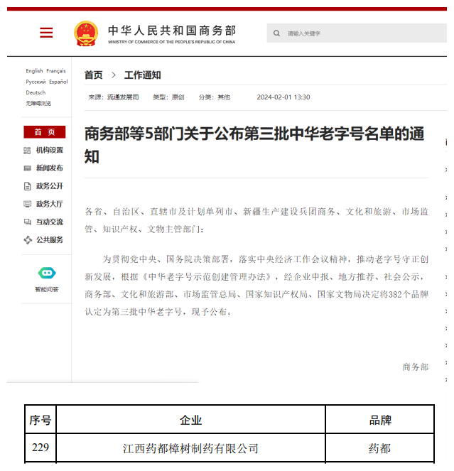 2024年2月1日下午,由商務(wù)部、文化和旅游部、市場監(jiān)管總局、國家知識產(chǎn)權(quán)局、國家文物局五部門聯(lián)合發(fā)文公布了382個品牌認(rèn)定為第三批中華老字號。仁和集團(tuán)旗下“藥都”品牌位列其中。據(jù)悉,此次江西共認(rèn)定13個中華老字號,“藥都”是唯一一個江西省醫(yī)藥品牌中華老字號。