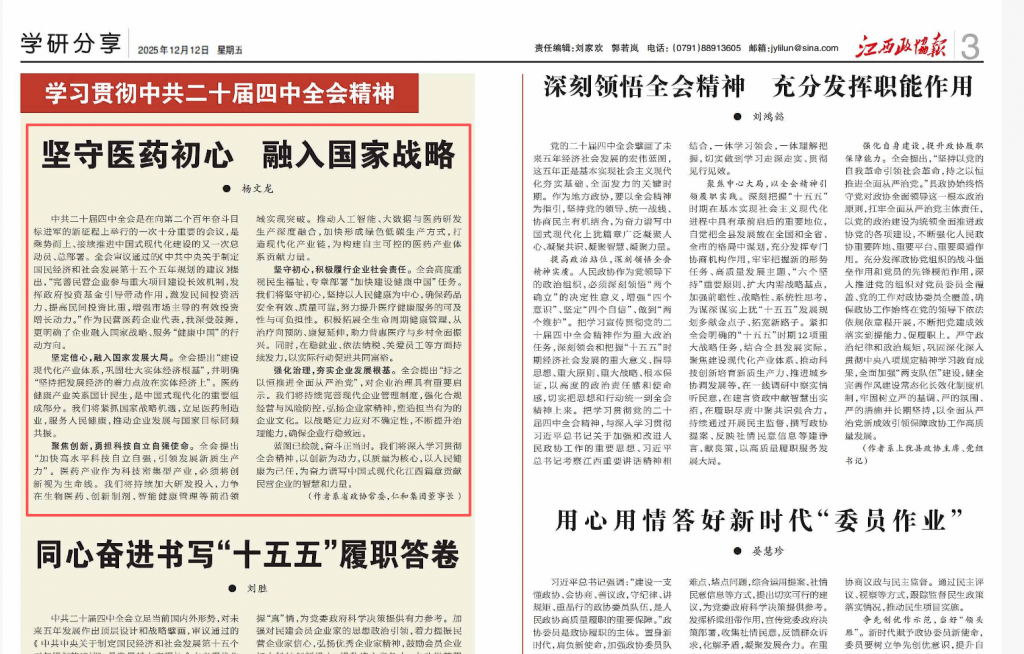 2025年12月12日,“江西省政協(xié)報”刊登了省政協(xié)常委、仁和集團董事長楊文龍署名文章《堅守醫(yī)藥初心 融入國家戰(zhàn)略》。該文章系楊文龍董事長于黨的二十屆四中全會勝利閉幕后,結合學習全會精神的體會感悟與企業(yè)自身發(fā)展情況所撰寫。